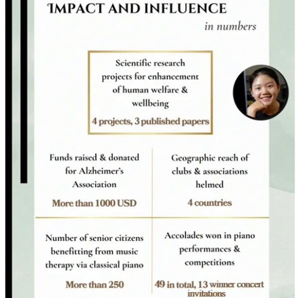 And she's conducted university-level lab research on Alzheimer's Disease. She's also made an impact through Orange County to the world, played piano at senior homes and founding a club committed to helping seniors learn healthy habits to slow the effects of aging.